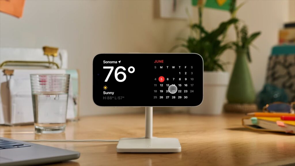 iOS 17 intègrera une nouvelle fonction StandBy pour l’iPhone. Apple l’a mise en avant avec un joli socle dans sa vidéo de présentation. Socle que la firme ne commercialisera pas sous sa marque. Voir la source